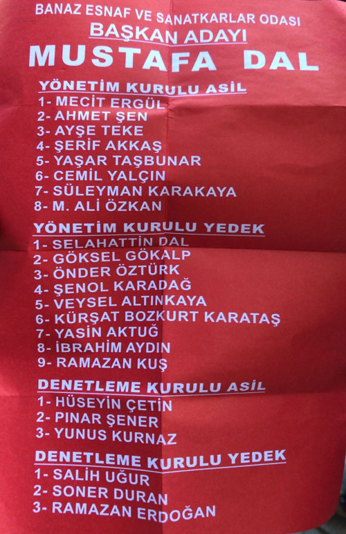 2 ay önce belirlenen seçime 4 aday katılıyor.Adaylar (1.Bayram Sargın Ulupınar (Çicekci) 2.Mustafa DAL (Yazıtepe Köyü (Oto Servisi) 3.ibrahim GÜNDÜZ ( Dümenler Köyü -(Marangoz) 4.Hasan DEMİR ( Çal İlçesi-Çiçekçi )bu 4 aday arasında Mustafa DAL’ın şansının daha yüksek olduğu görülüyor.Hem Banazlı olması hemde 35 yıldır sanayide esnaf olması oy yüzdesini arttıracağı düşünülüyor.Diğer yandan 3 aday henüz yönetim listesini Basına ve esnaflara sunmazken,Dal yönetim listesini günler önce açıklayarak esnaflara seçime en hazır başkan adayı olduğunu gösterdi. Banaz Sanayi Sitesi ziyaretinde esnafları tek tek ziyaret eden Başkan Adayı Mustafa DAL ,yapacak olduğu tüm projeleri anlatarak , seçim öncesi esnafların güvenini kazandı Mustafa Dal'ın projeleri Banaz esnafının ve çiftcisi'nin yüzünü güldüreceği kapsam da olduğu görünüyor.Mustafa Dal'ın projeleri ise şöyle:
