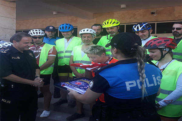 Sporculara Soğuk ve sıcak ikramlar yapılırken; Emniyet Müdürü Gezer Türkiye’miz için yapmış olduğunuz bu davranış bizleri çok mutlu etti.Biz Kurtuluş Savaşımızın geçtiği o topraklara görevimiz gereği gidemiyoruz. Size Türk Bayrağımızı ve Emniyet Genel Müdürlüğümüzün bayrağını hediye etmek istiyorum dedi..jpg)