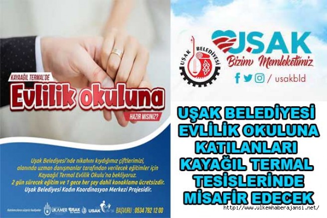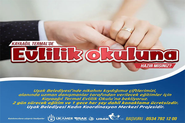 Uşak Belediyesi Kadın Koordinasyon Merkezi (UKAMER) tarafından 2022 Yılında Başlatılan Evlilik Okulunun 4. Dönem kayıtları başladı. Alanında uzman danışmaların çeşitli konularda eğitimler vereceği evli çiftlere Kayağıl Termal Tesislerin’de bir gece konaklama imkanı Uşak Belediyesi tarafından tamamen ücretsiz olarak karşılanacak.