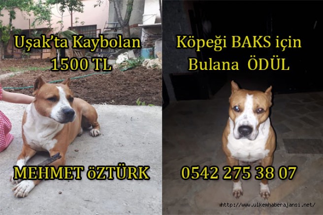 Telefon ile Haber Ajansımıza ulaşan Öztürk, Köpeğimiz Uşak Şehit Veli Uludağ Sokak’ta saat 14:00 ile 21:00 civarı evimizin bahçesindeki kilitli kulübesinden kaçırılmış olabileceğini düşünüyorum. Köpeğimiz akıllı ve eğitimlidir, kendiliğinden gitmiş olamaz. Çünkü Bahçemizde ve bulunduğu kulübe kilitlidir. Bulan gören vatandaşlarımıza 1500 tl para ödülü vereceğim. Diğer yandan evimiz A101 Market karşısında orada güvenlik kameraları mevcut adli mercilere başvuruda bulunduk. Ben köpeğimizin kulübeden şahıs ve şahısların çalmak amacıyla götürdüklerini düşünüyorum dedi.