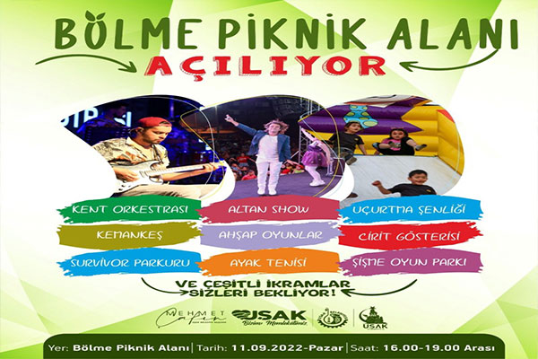Uşak Belediyesi tarafından kapsamlı bir çalışma yapılarak kente kazandırılan, yan kısmında ise çeşitli revizyonlar yapılarak genişletilen cirit sahası ile 35.000 m 2 ’lik bir bölgeyi kapsayan Bölme Piknik Alanı birçok donatıyı barındıracak.450 metre uzunluğunda yürüyüş ve koşu parkuru, 44 adet kamelya ve barbekü, çocuk oyun grubu, mescit ile lavabolar bulunan ve her koridorunda farklı ağaç türleri barındıran piknik alanı, stresten uzaklaşmak isteyen aileler için iyi bir seçenek olacak. Bölme Piknik Alanı, 11 Eylül Pazar günü saat 16.00’da başlayacak etkinliklerle vatandaşlara coşkulu bir programla kapılarını açacak. Program kapsamında yarışmalardan gösterilere birçok keyifli etkinlik vatandaşla buluşacak