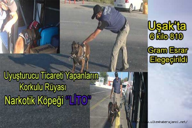 Uyuşturucu suçlarla mücadele de kararlığını devam ettiren kolluk küvetleri 19.08.2021 günü Uşak’ta yaptıkları istihbari çalışmalar neticesinde, kargo aracılığıyla uyuşturucu madde sevkiyatı yapılacağının tespiti üzerine, kargo aracını takibe aldı. Uşak il merkezinde durdurulan araca uyuşturucu ticareti yapanların korkulu rüyası detektör köpek (LİTO) bırakıldı. Koli içerisine saklanılan esrar maddesini tespit edip, tepki gösteren (LİTO) 6 kilo 810 gram Esrar maddesinin yakalanmasını sağladı.